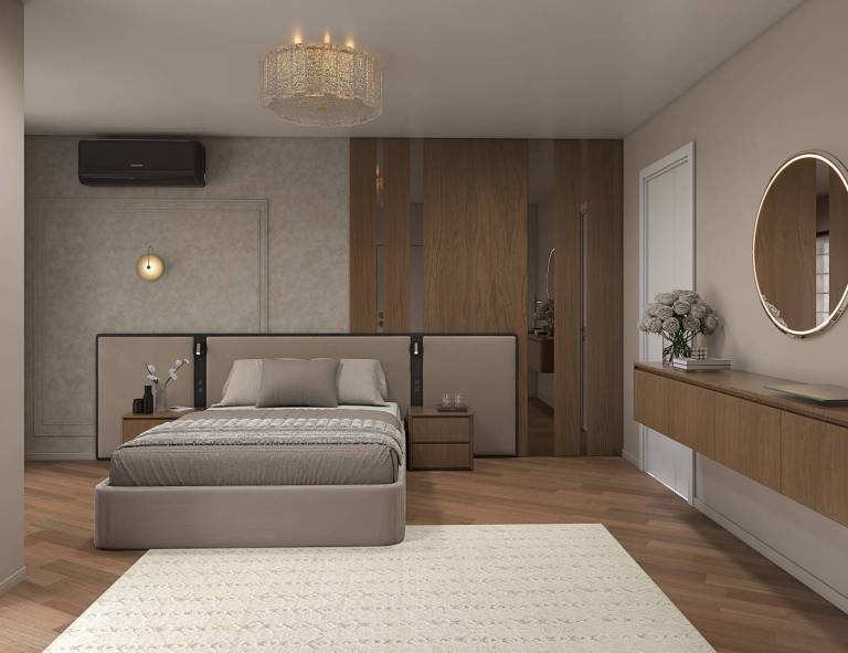 По-тъмните дървесни тонове, графитът и меките кашмирени нюанси създават дълбочина и спокойна атмосфера.